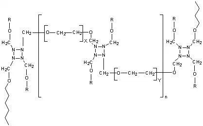 疏水改性聚醚增稠劑(HMPE)疏水改性聚醚增稠劑的性能與HEUR相似,產(chǎn)品有Hercules的Aquaflow NLS200、NLS210和NHS300。改性聚脲增稠劑是BYK公司開發(fā)的增稠劑,其結(jié)構(gòu)如圖4所示。它的增稠機(jī)理是既有氫鍵的作用,也有端基的締合作用。與一般增稠劑比較,它的防沉降和抗流掛性能好。根據(jù)端基的不同極性,改性聚脲增稠劑可分為三種:低極性聚脲增稠劑、中極性聚脲增稠劑和高極性聚脲增稠劑。前二種用于溶劑型涂料增稠,而高極性聚脲增稠劑既可用于高極性溶劑型涂料中,也可用于水性涂料增稠。低極性、中極性和高極性聚脲增稠劑的商品分別如BYK-411、BYK-410和BYK-420。