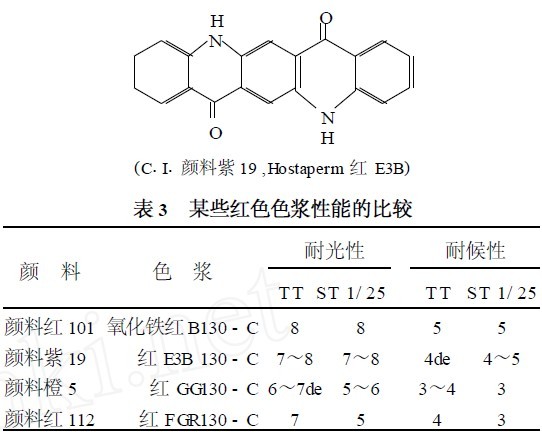 如果需要鮮艷的紅色或淡紅色用于外墻乳膠漆,且性能與氧化鐵紅相接近,可使用顏料紅122或顏料紫19。顏料紫19有6種晶型,有多種商品牌號(hào),Hostaperm紅E3B(γ型) 是最適宜的品種,因?yàn)槠渚哂凶吭降哪秃蛐院湍凸庑?。某些紅色色漿性能的比較見(jiàn)表3。