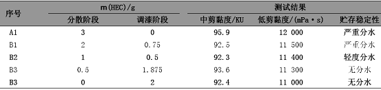 試驗(yàn)設(shè)計(jì)A:將配方體系中HEC的總含量固定為0.3%,然后以上面介紹的添加方式搭配調(diào)制乳膠漆,分別測試其低剪切和中剪切黏度,進(jìn)行對比,并對比熱貯存穩(wěn)定性(貯存條件:50℃貯存30d)。試驗(yàn)設(shè)計(jì)B:與A組試驗(yàn)對應(yīng)(A2-A5),不改變分散階段HEC的加入量,調(diào)整調(diào)漆階段HEC的加入量,將乳膠漆的中剪黏度調(diào)至相同,對比熱貯存穩(wěn)定性(貯存條件:50℃貯存30d)。