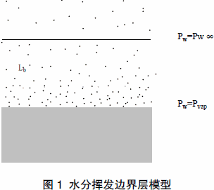 水分揮發(fā)界面層擴(kuò)散模型(見圖1)認(rèn)為水分子揮發(fā)進(jìn)入空氣,其液氣界面的蒸汽壓達(dá)到水的飽和蒸氣壓,水氣界面上方存在一個高度為Lb 的邊界層,邊界層上部水的蒸氣壓與大氣環(huán)境水蒸氣壓相同,在邊界層內(nèi),隨著高度增加從界面的飽和蒸氣壓線性降低到外部環(huán)境水的蒸氣壓。水的揮發(fā)速度決定于水分子擴(kuò)散通過此邊界層的速度。