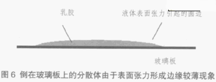 科學(xué)家感興趣的是為何會產(chǎn)生這種水平干燥的現(xiàn)象,將乳膠或高分子分散體倒在玻璃板上時,由于表面張力作用其乳膠邊緣出現(xiàn)圓弧現(xiàn)象,邊緣較薄,見圖6。