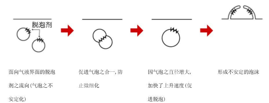 破泡:相對于泡沫(泡沫聚合體),從空氣側(cè)侵入泡中,將泡合一破壞。即破泡劑吸附于氣泡后,因表面張力之作用侵入氣泡膜中。隨后,表面張力因破泡劑在泡膜表面的擴張,使泡膜變薄, 進而破壞泡膜。