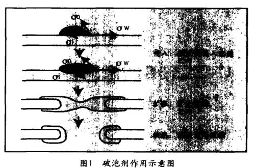 破泡劑通過吸附泡和與表面張力的作用侵入泡膜。其后,表面張力將破泡劑擴(kuò)散于泡膜的表面,使泡膜變薄,破壞泡沫(如圖1所示)。