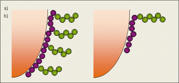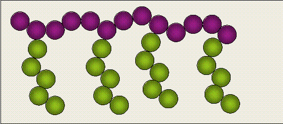 圖1:相同組成但結(jié)構(gòu)不同的聚合物:a)統(tǒng)計分布的共聚物b) AB嵌段共聚物 |