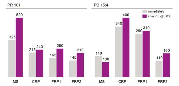 圖4顯示的是儲存前后顏料濃縮漿的動態(tài)粘度。研究所用的分散劑(CRP,F(xiàn)RP1,F(xiàn)RP2)均有良好穩(wěn)定的粘度性能。測量結(jié)果上不同的產(chǎn)品之間并無明顯區(qū)別。從趨勢上看,優(yōu)化的潤濕分散劑(FRP2)的降粘效果更為明顯。采用市場標準產(chǎn)品(MS)制得的藍顏料濃縮漿儲存后粘度有所下降。這說明顏料分散后才被潤濕,顯示潤濕效果更慢。而儲存后的含MS的PR 101濃縮漿則產(chǎn)生了負面的增粘效果。