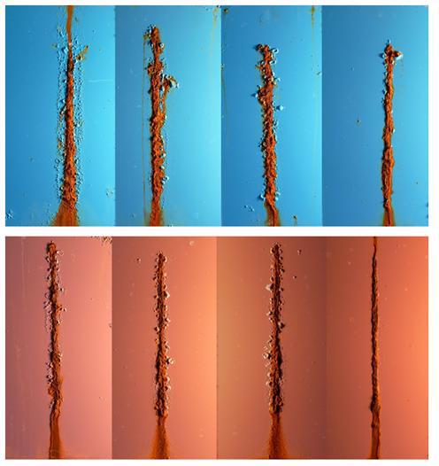 圖5:鹽霧測試結(jié)果(DIN EN ISO 9227;1200 h)(體系:基于顏料PB15:4(上)和PR 101(下)的水性雙組份聚氨酯涂料;基材:鐵板;分散劑:從左至右為MS,CRP,FRP1,FRP2)