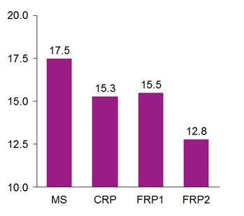 表2列出的是本實驗所測試產(chǎn)品的顏色性能,可以看到性能接近,但是FRP2的著色力和相容性(霧影)更好一些。和市場標準產(chǎn)品(MS)相比,含測試產(chǎn)品(CRP,F(xiàn)RP1,F(xiàn)RP2)的有機藍顏料展現(xiàn)出稍高的著色力。而對于無機紅顏料,和市場標準產(chǎn)品相比相容性更好,著色力則稍高(高5%)。