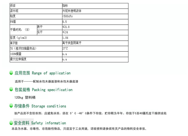 - 用途:可用于配制水性木器面漆和水性木器底漆