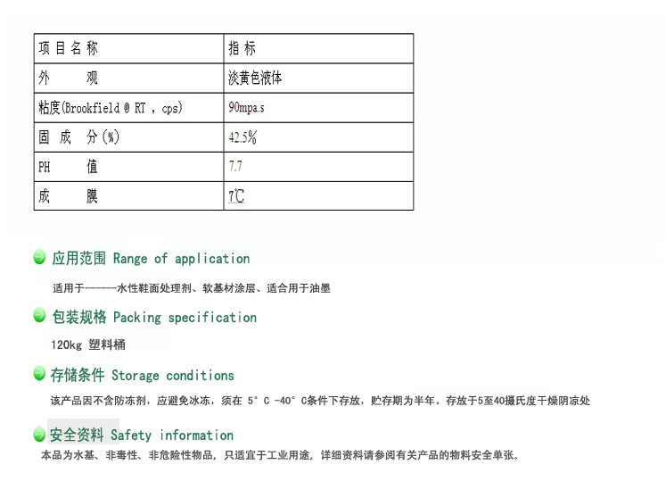 - 用途:水性鞋面處理劑,軟基材涂層,適合用于油墨