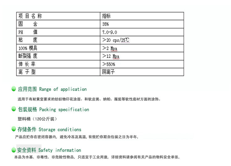 - 用途:適用于有耐黃變要求的紡織物印花涂層,和軟皮類(lèi)、納帕、服裝等軟性底材方面的涂飾。