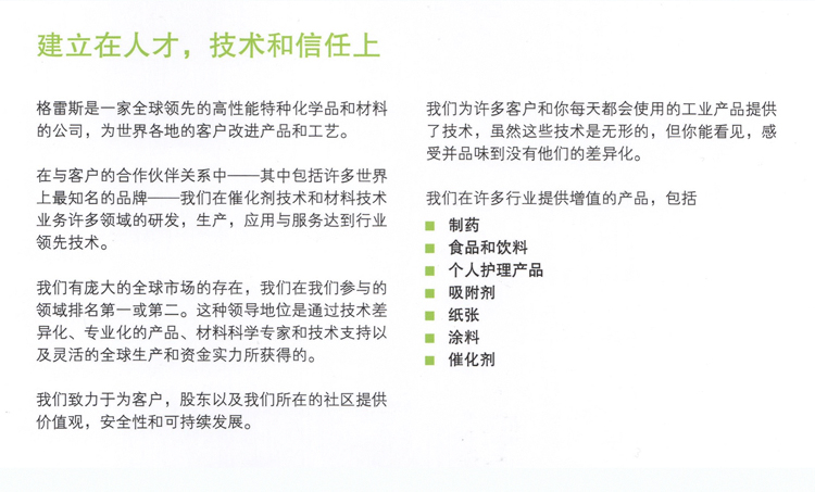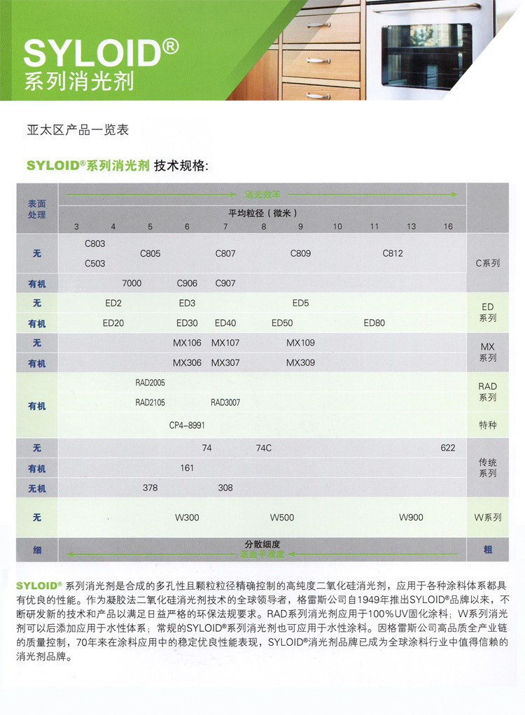 SYLOID系列消光劑是合成的多孔性且顆粒粒徑精確控制的高純度二氧化硅消光劑,應(yīng)用于各種涂料體系都具有優(yōu)良的性能。作為凝膠法二氧化硅消光劑技術(shù)的全球領(lǐng)導(dǎo)者,格雷斯公司自1949年推出SYLOID品牌以來(lái),不斷研發(fā)新的技術(shù)和產(chǎn)品以滿足8益嚴(yán)格的環(huán)保法規(guī)要求。RAD系列消光劑應(yīng)用于100%UV固化涂料: W系列消光劑可以后添加應(yīng)用于水性體系:常規(guī)的SYLOID系列消光劑也可應(yīng)用于水性涂料。因格雷斯公司高品質(zhì)全產(chǎn)業(yè)鏈的質(zhì)量控制,70年來(lái)在涂料應(yīng)用中的穩(wěn)定優(yōu)良性能表現(xiàn),SYLOID消光 劑品牌已成為全球涂料行業(yè)中值得信賴的消光劑品牌。